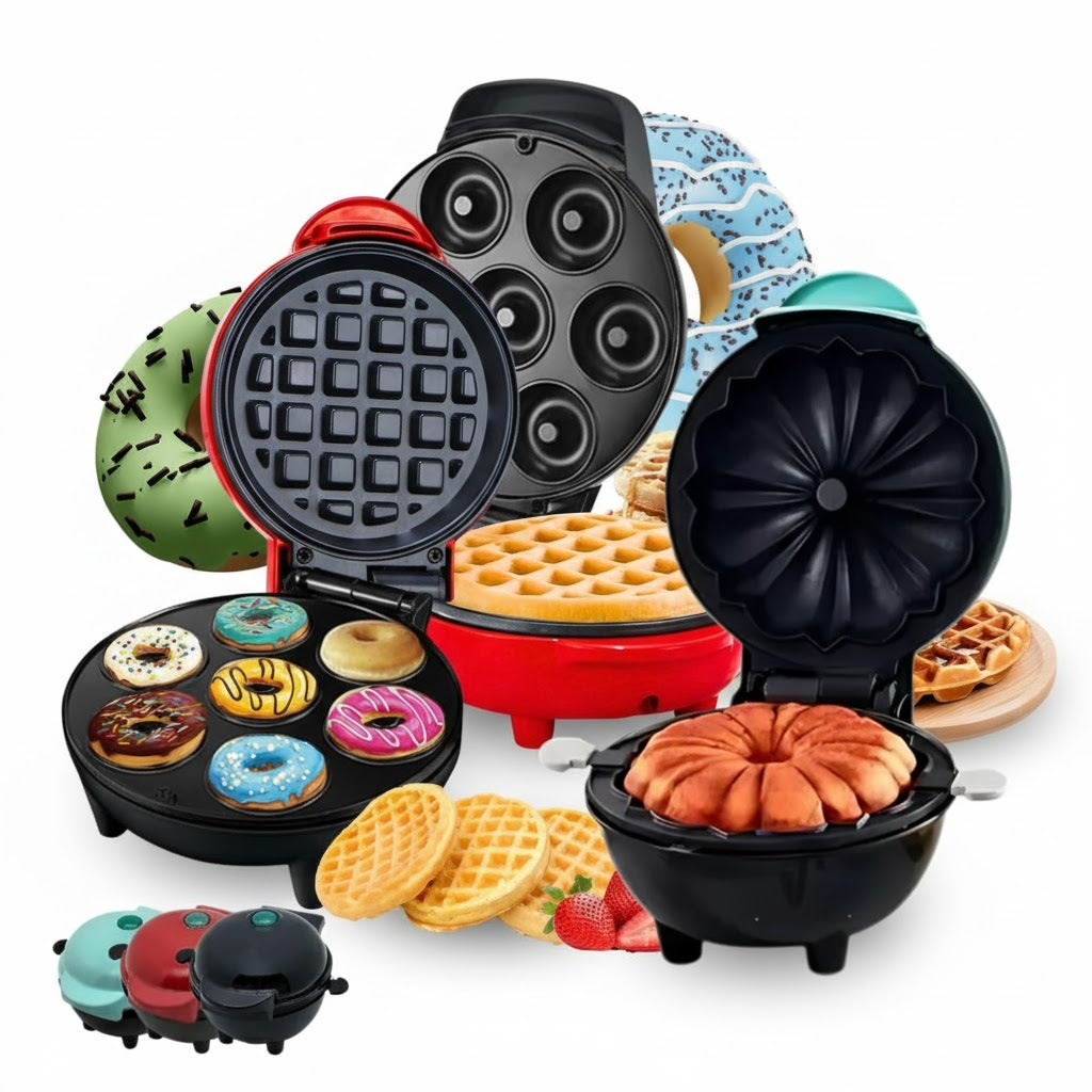 Transforme sua cozinha em uma verdadeira confeitaria com o Kit Completo Mini Confeitaria, composto por 3 mini máquinas elétricas portáteis ideais para preparar bolos, donuts e waffles de forma prática, rápida e deliciosa!